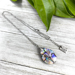 Tree of Life Teardrop Abalone Shell Wire Wrapped Pendant 18” White Gold Necklace  - Regular price