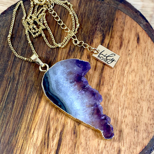 • Ethereal Limited Amethyst Angel Wing Sliced Geode Pendant 18” Gold Necklace
