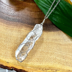 Basket Weave Wire Wrapped Crystal Clear Quartz Raw Pendant 30” White Gold Necklace  - Regular price