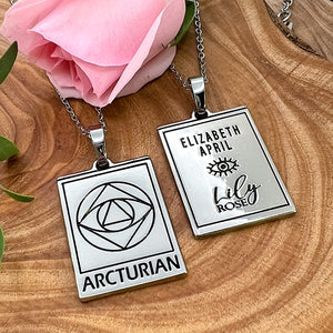Elizabeth April EA Arcturian 2 Sided Channeled & Attuned Evil Eye Protection Cosmic Species Sacred Geometry Card Tag Pendant 18” White Gold Necklace