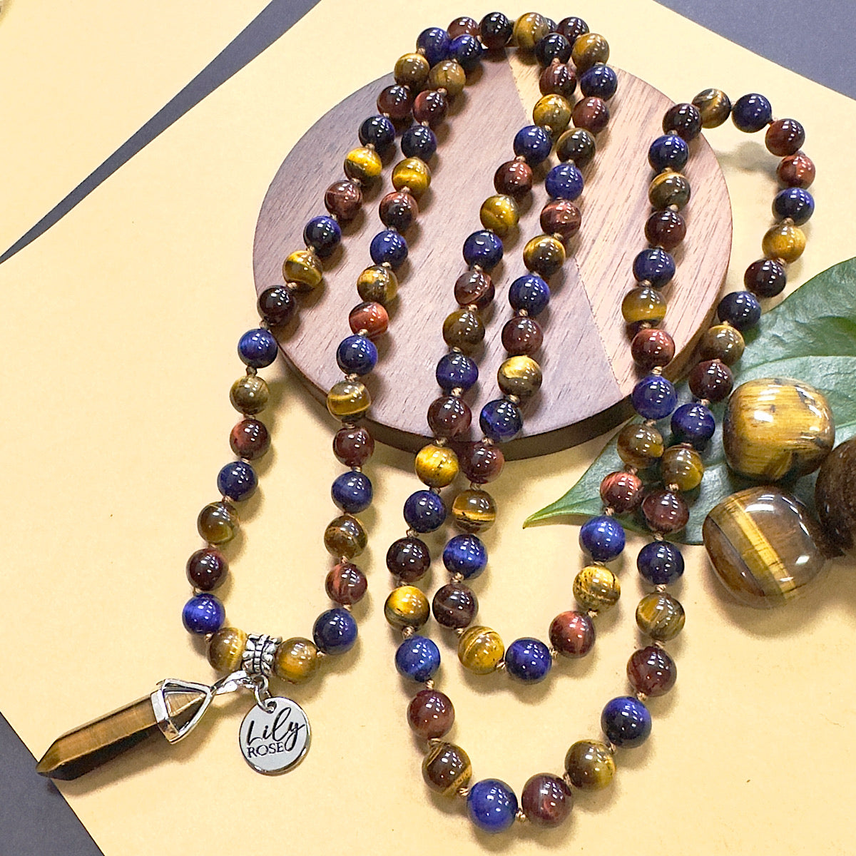 Extra Energy Boost: This Mala is adorned with a double terminated hexagonal yellow Tigers Eye point pendant and a Lily Rose brand white gold vermeil lotus charm. The Tigers Eye point pendant adds an extra vibrational boost, amplifying the healing properties of the gemstone.