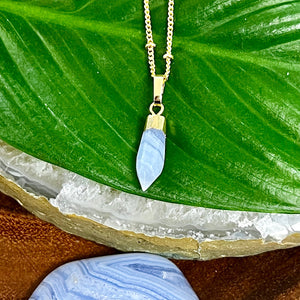 Blue Lace Agate Serenity & Calm Faceted Point Pendant 18" Gold Necklace