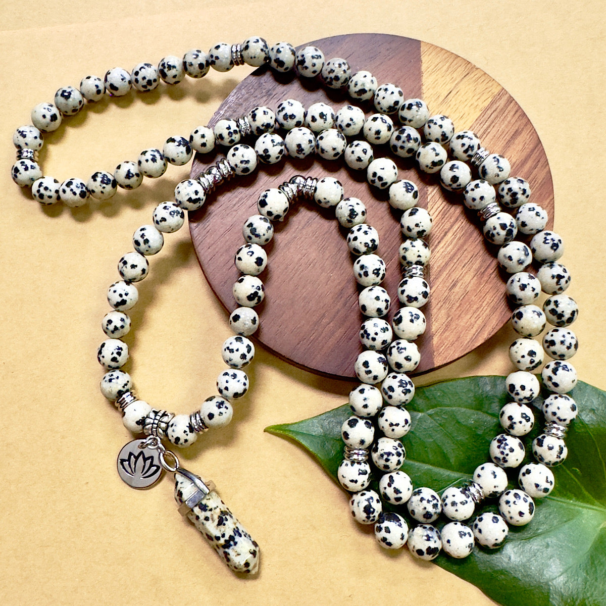 Extra Energy Boost: This Mala is adorned with a double terminated hexagonal Dalmatian Jasper point pendant and a Lily Rose brand white gold vermeil lotus charm. The point pendant adds an extra vibrational boost, amplifying the healing properties of the gemstone.