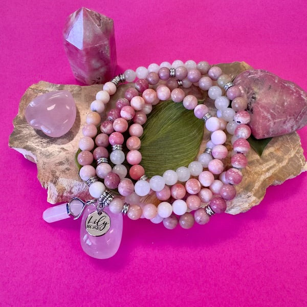 This mala features a beautiful gradation of high grade Pink Opal, Rose Quartz, Rhodonite, and Rhodochrosite in the center, as it loops back around to bring this intentional mala to life.