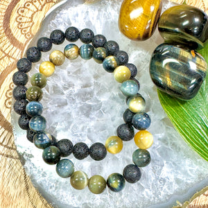 Lava Stone & Honey Blue Tigers Eye Matching Couples Unity & Love 8mm Stretch Distance Bracelets