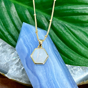 Blue Lace Agate Serenity & Calm Minimalist Faceted Hexagon Pendant 18" Gold Necklace
