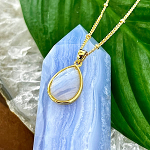 Blue Lace Agate Serenity & Calm Faceted Teardrop Pendant 18" Gold Necklace