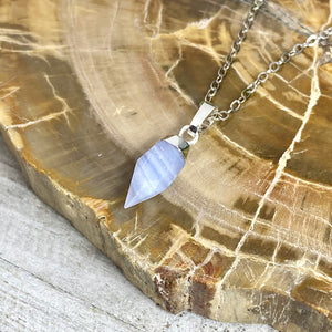 Blue Lace Agate Serenity & Calm Faceted Point Pendant 18" White Gold Necklace